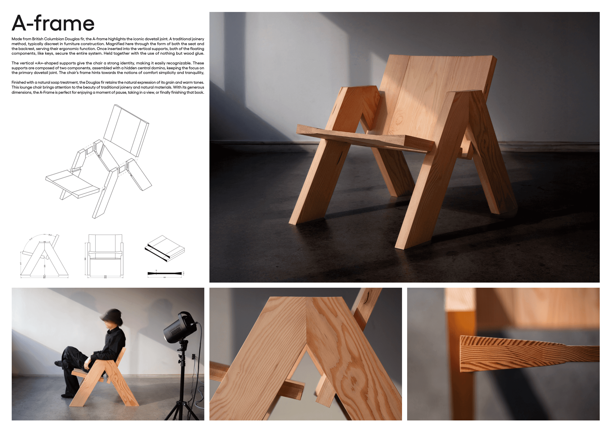 The A-Frame Chair was designed and built by Arthur Lambertblouin as part of his final project at UQAM. I collaborated closely with Arthur to create a visual series that highlighted the chair’s structure, materials, and craftsmanship. Through controlled lighting and minimal composition, the goal was to emphasize form, shadow, and function — translating his design into a clean, architectural visual language.